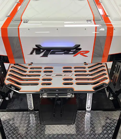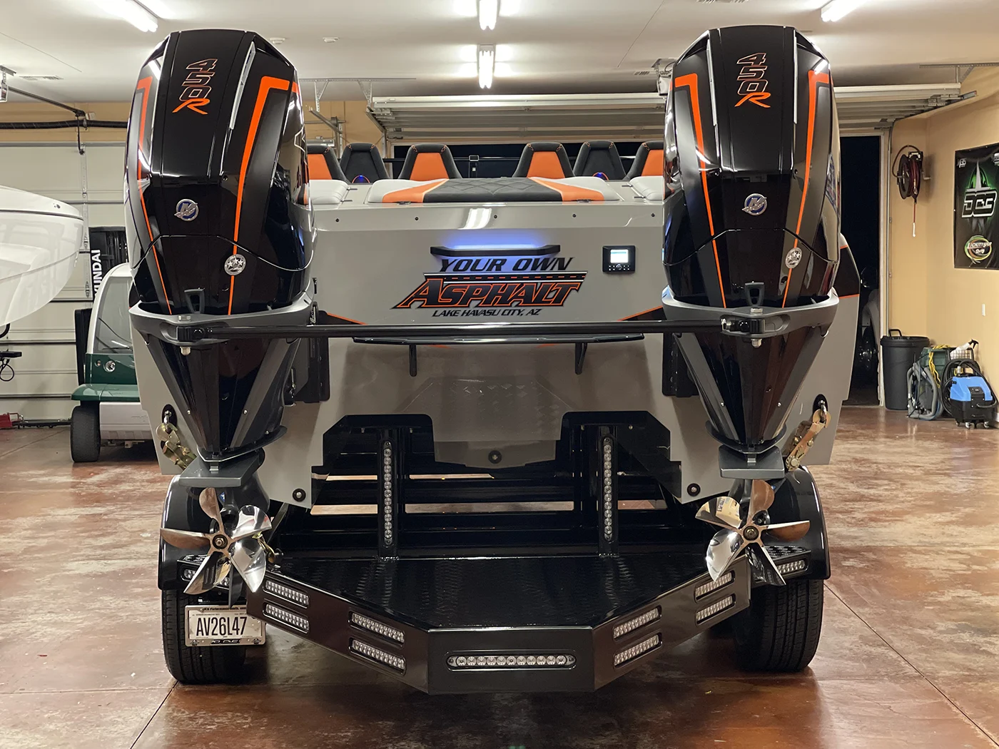 We collaborate with Wes Jones Design to deliver custom graphics. Every vessel features a premium gel coat finish with a striking black windshield register, complemented by high-gloss detailing.