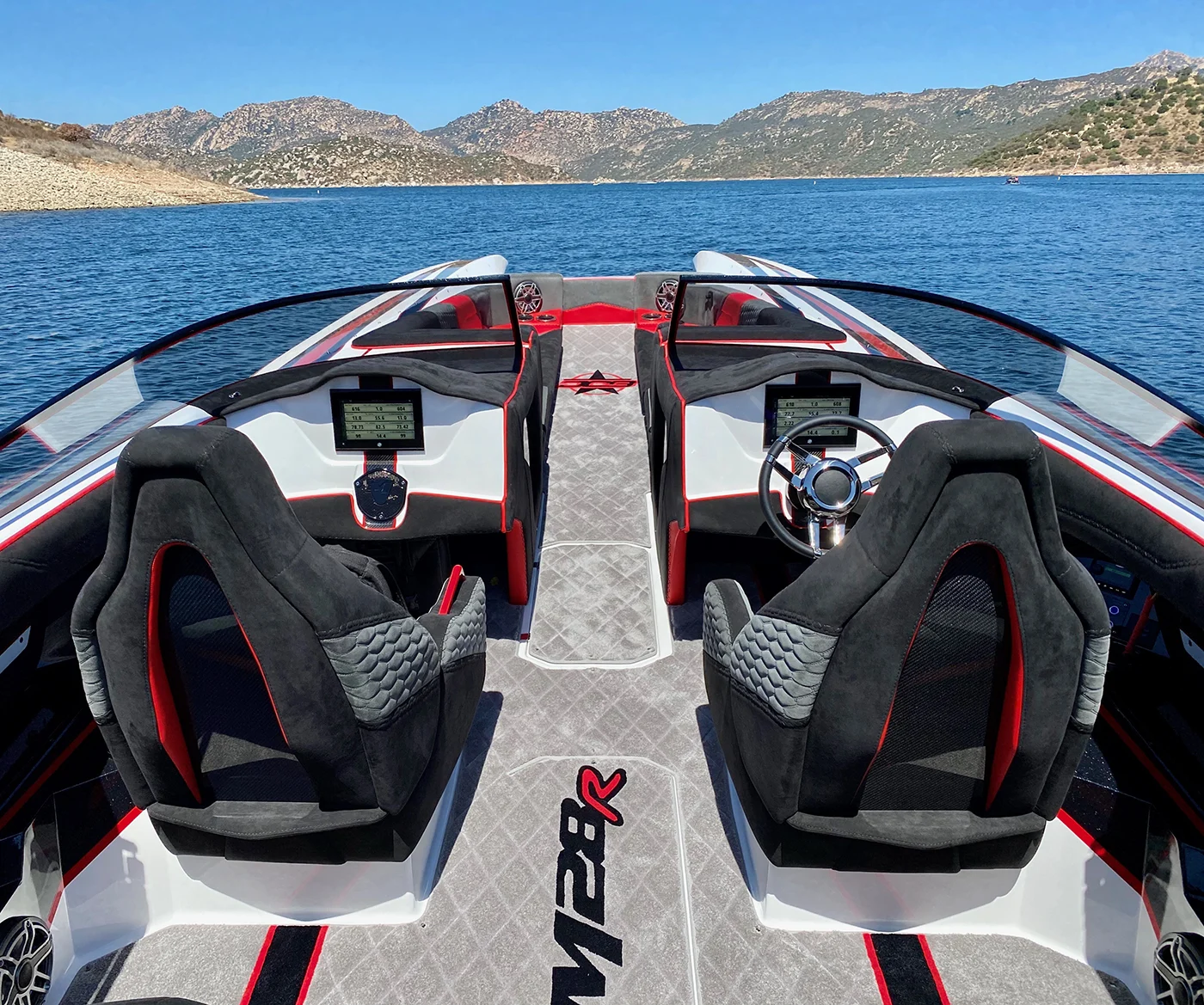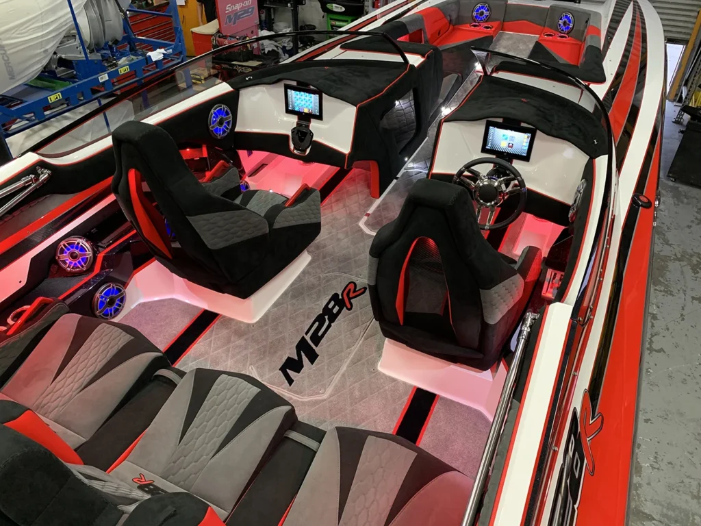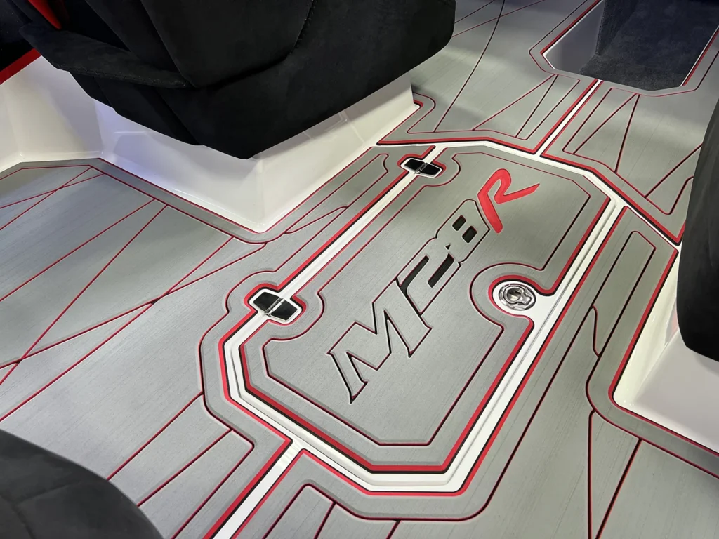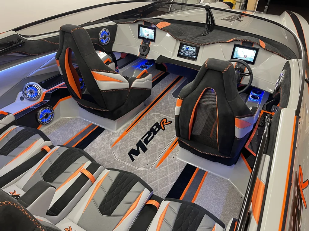 M28R six-seater blends luxury and performance with power-adjustable bolsters, billet footrests, an Alcantara dash with French stitching, and custom marine flooring options. Every detail is designed for comfort and style