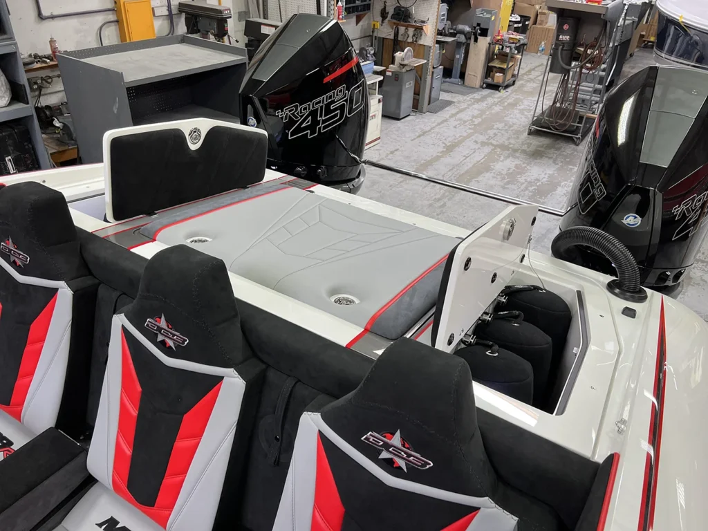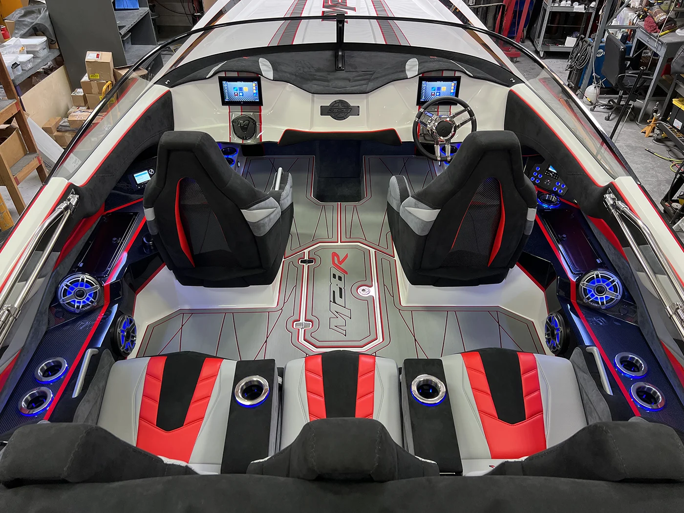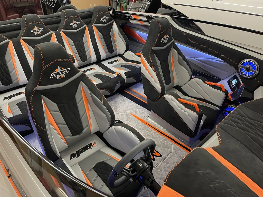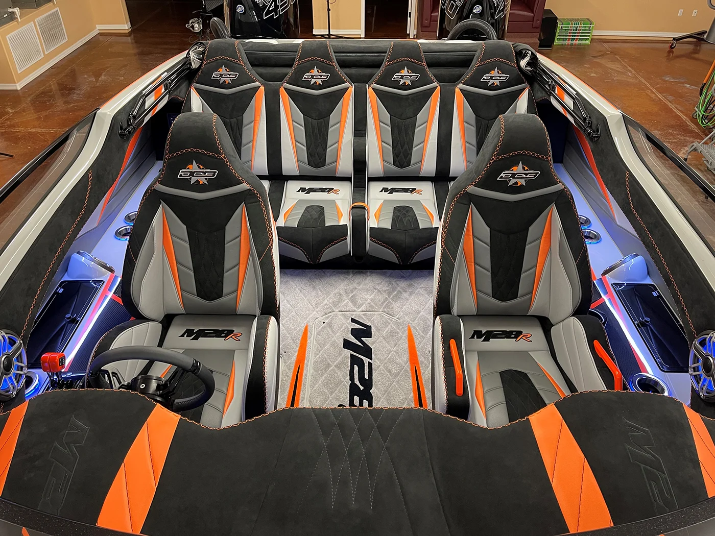 M28R six-seater blends luxury and performance with power-adjustable bolsters, billet footrests, an Alcantara dash with French stitching, and custom marine flooring options. Every detail is designed for comfort and style