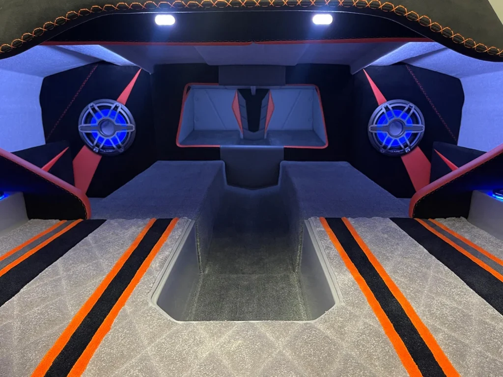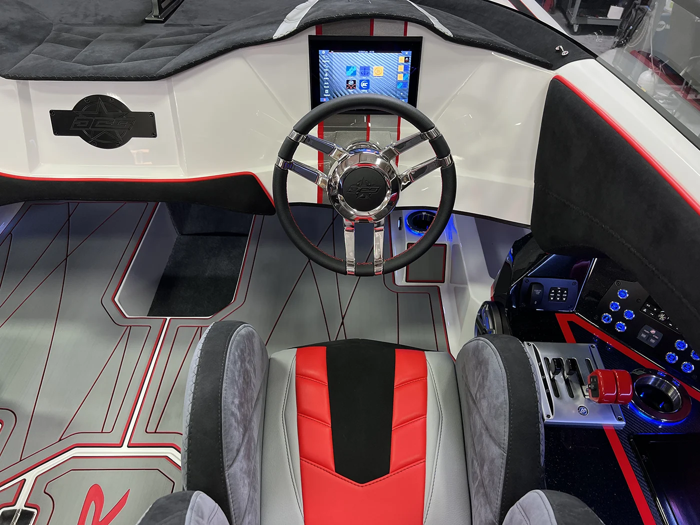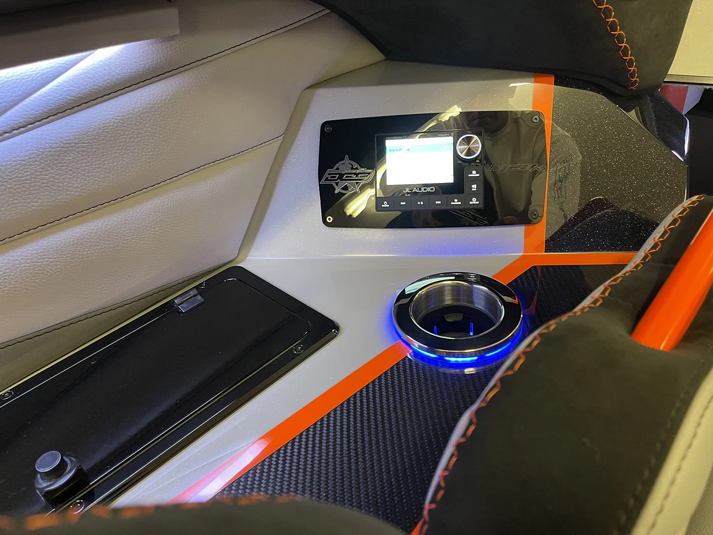 Equipped with precision billet LED navigation lights, paired with a sleek nav/anchor light pole for optimal visibility. Full digital RGBW accent lighting under the dash, in cup holders, speakers, and an immersive atmosphere both day and night.