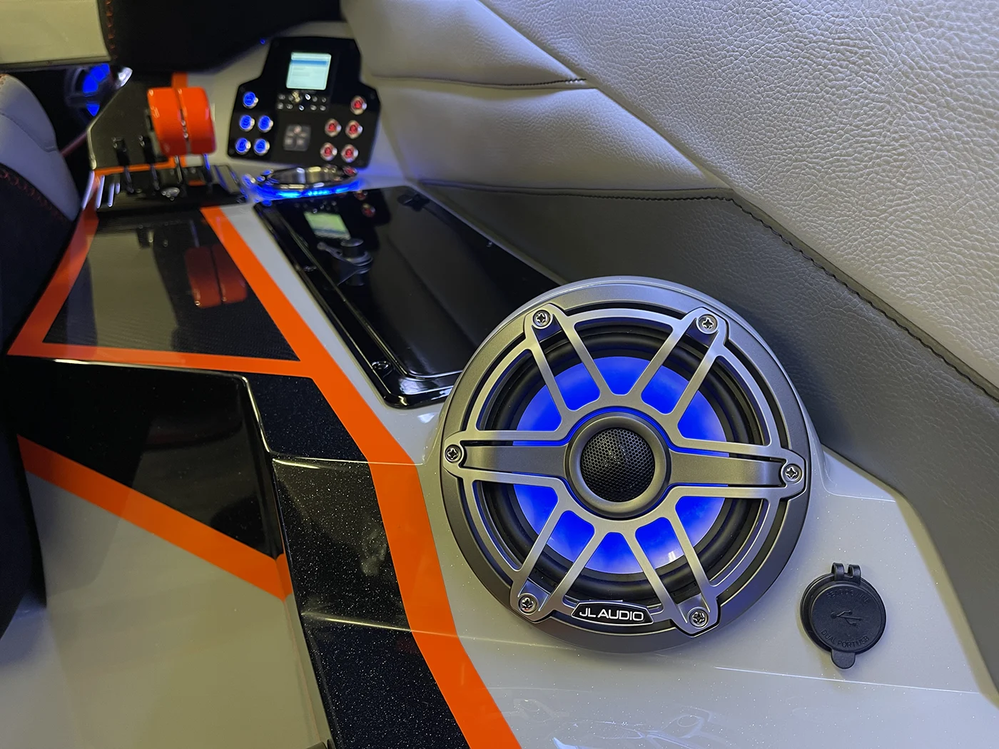 - Fusion marine bluetooth/ Wifi head unit MSRA770 • 4 JL Audio 6.5″ coaxial speakers
