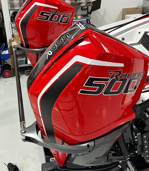 We collaborate with Wes Jones Design to deliver custom graphics. Every vessel features a premium gel coat finish with a striking black windshield register, complemented by high-gloss detailing.