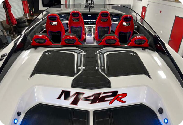 The M42R is available in a six or eight-seat configuration. Blending luxury and performance with power-adjustable bolsters, billet footrests, an Alcantara dash with French stitching, and custom marine flooring options, every detail is designed for comfort and style.